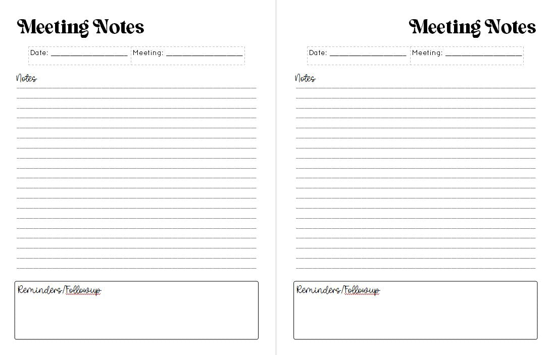 If you love having a convenient notebook or journal to keep track of meetings throughout the year, this letter-sized journal (8.5 x 11 inches) is perfect for you. This compact journal includes more than 60 individual meeting pages, perfect for writing notes and documentation in your faculty meetings, parent conferences, and professional development sessions. It also includes more than 10 pages for miscellaneous notes, and several to-do lists.